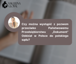 Teoretycznie możliwe jest wniesienie pozwu do polskiego sądu, jednak w praktyce pojawia się szereg istotnych trudności, w tym: Oddział Państwowego Przedsiębiorstwa „Dokument” w Polsce zarejestrowany